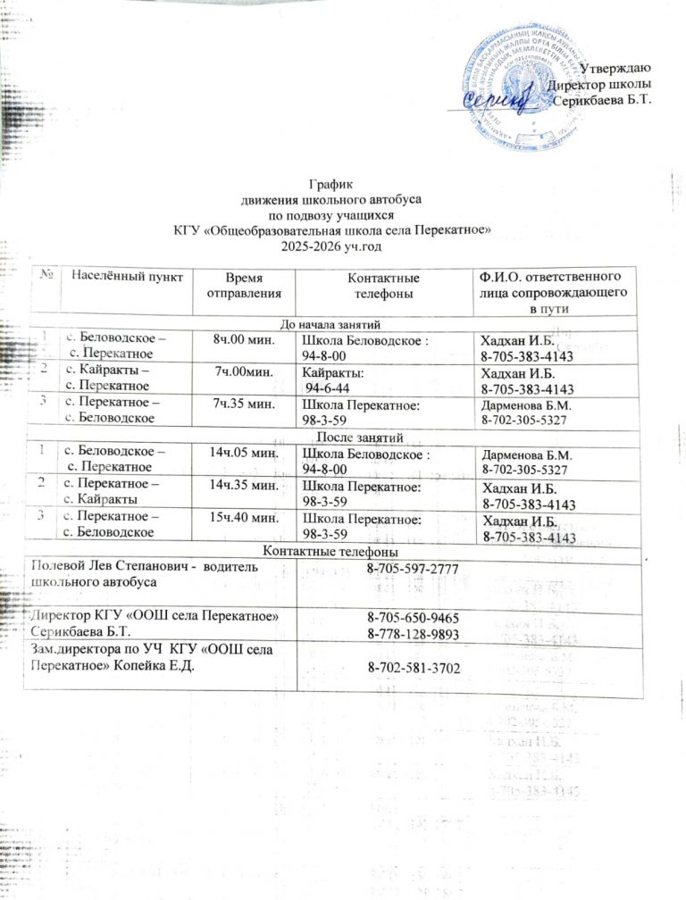Оқушыларды тасымалдауға арналған мектеп автобусының 2025-2026 оқу жылына арналған қозғалыс кестесі